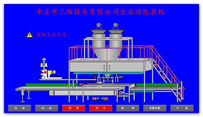 如出現(xiàn)圖中報(bào)警信息時(shí),在處理完報(bào)警內(nèi)容并且沒(méi)有報(bào)警信息后,點(diǎn)擊“自動(dòng)”按鈕,或外部旋鈕選擇,此時(shí)“自動(dòng)”按鈕顯示為亮綠色,提示切換完成,按儀表啟動(dòng)按鈕,啟動(dòng)稱料系統(tǒng),點(diǎn)擊屏幕或外部“啟動(dòng)”按鈕,設(shè)備啟動(dòng)時(shí)首先經(jīng)過(guò)6秒左右的初始化,報(bào)警燈伴隨聲光報(bào)警,提示相關(guān)人員設(shè)備啟動(dòng),套袋擺臂執(zhí)行一個(gè)抬起落下動(dòng)作,以回到準(zhǔn)備位置,抱袋小車如不在準(zhǔn)備位置則回到準(zhǔn)備位置。初始化完成后,屏幕上啟動(dòng)按鈕亮起,設(shè)備進(jìn)入正常工作狀態(tài)。
