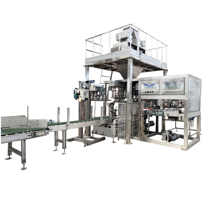 設備組成主要包括:包裝袋輸送機、上袋機、抽氣裝置、自動折邊、縫包機、輸送機等。